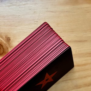 卡牌設計不俗,卡邊為鮮紅色,十分吸引,可是紙質普通,表面好像有一層霧面,印刷方面的確不算討好,影響精心設計的畫面。雖然牌身厚,不易屈曲,但表面很「啜」,難推牌。