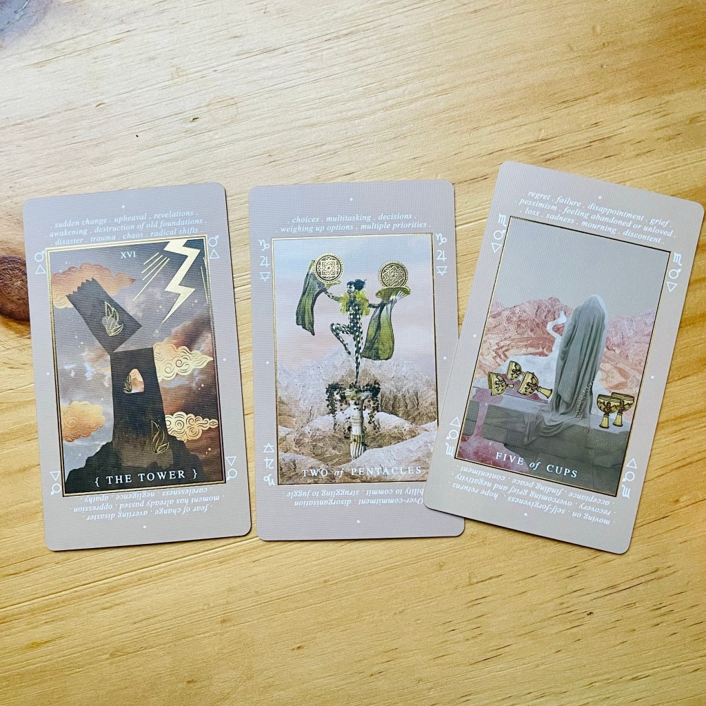[5 of Cups] 聖杯五。見到啲杯分左右兩邊,望住三隻杯嗰邊,感覺抱歉同可惜。