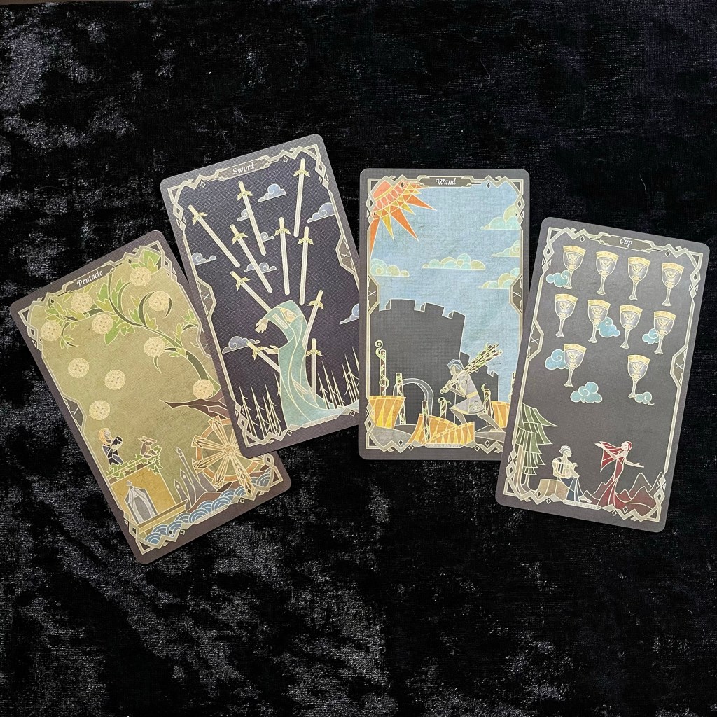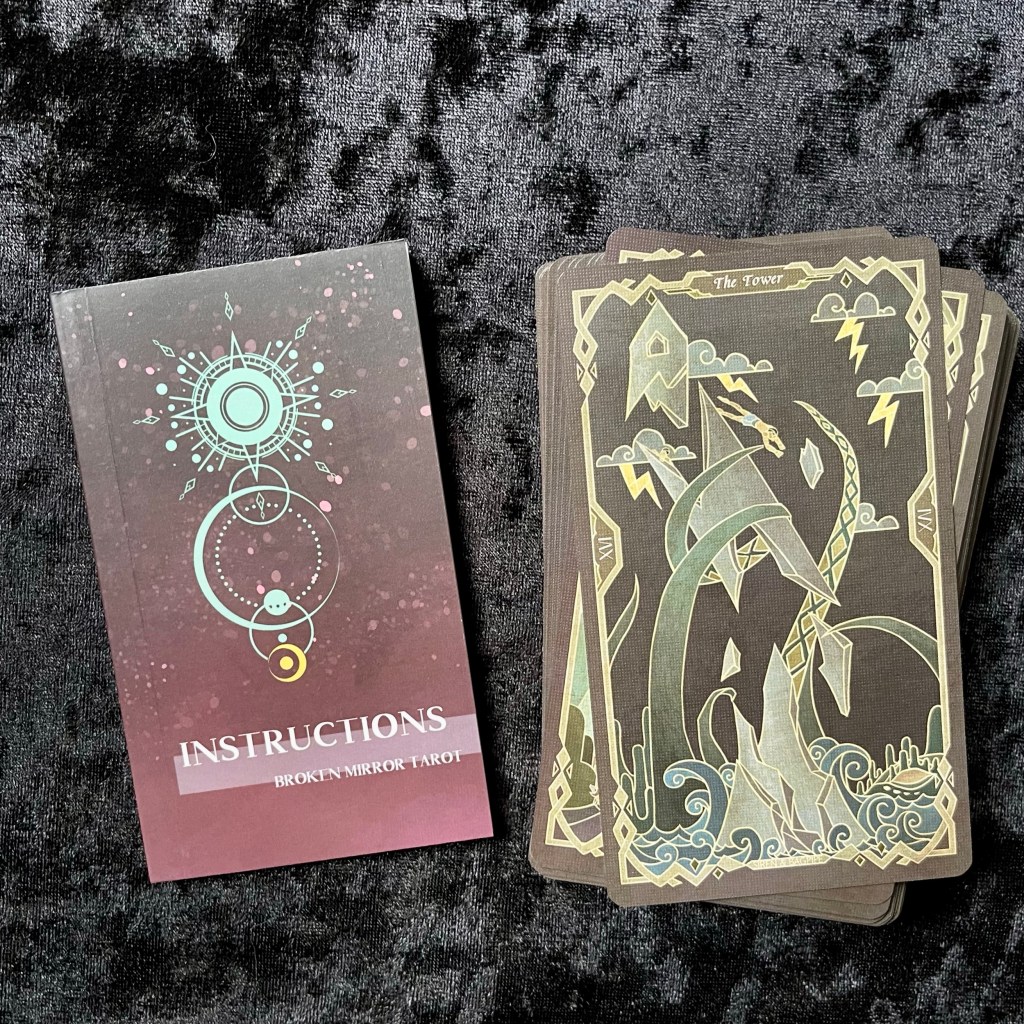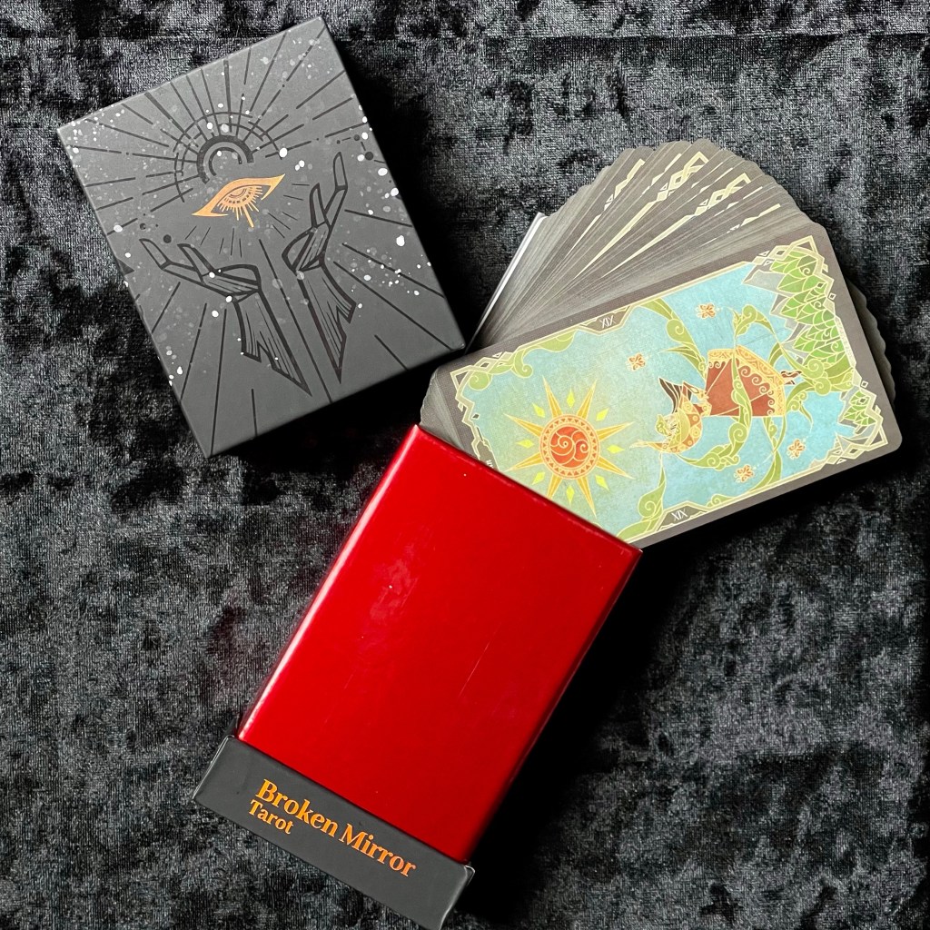 Broken Mirror Tarot 系列一年一版,每版都有小更新小改變,今次 2022 年來到五周年,更是一口氣推出三個版本:Emerald(翡翠)、Sapphire(藍寶石)及 Obsidian(黑曜石)三款不同顏色及設計。由於我不懂馬賽塔羅,所以只買偏向寶綠色的 Emerald 及大地色的 Obsidian。這篇就先介紹 Obsidian。