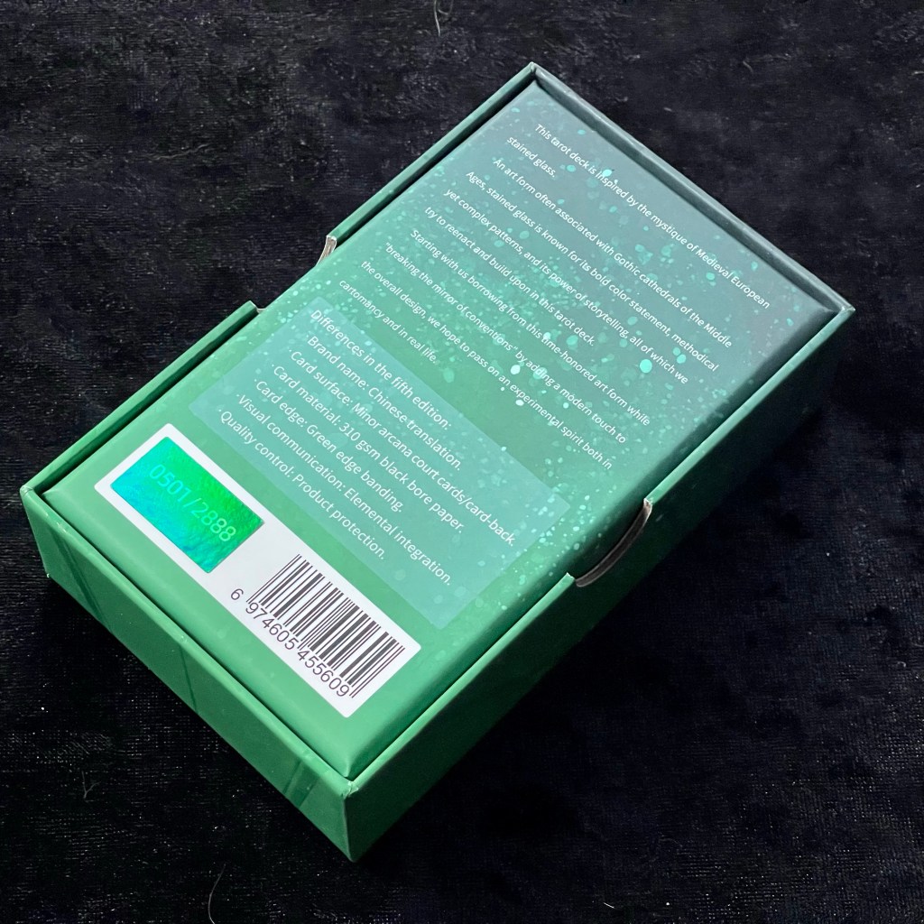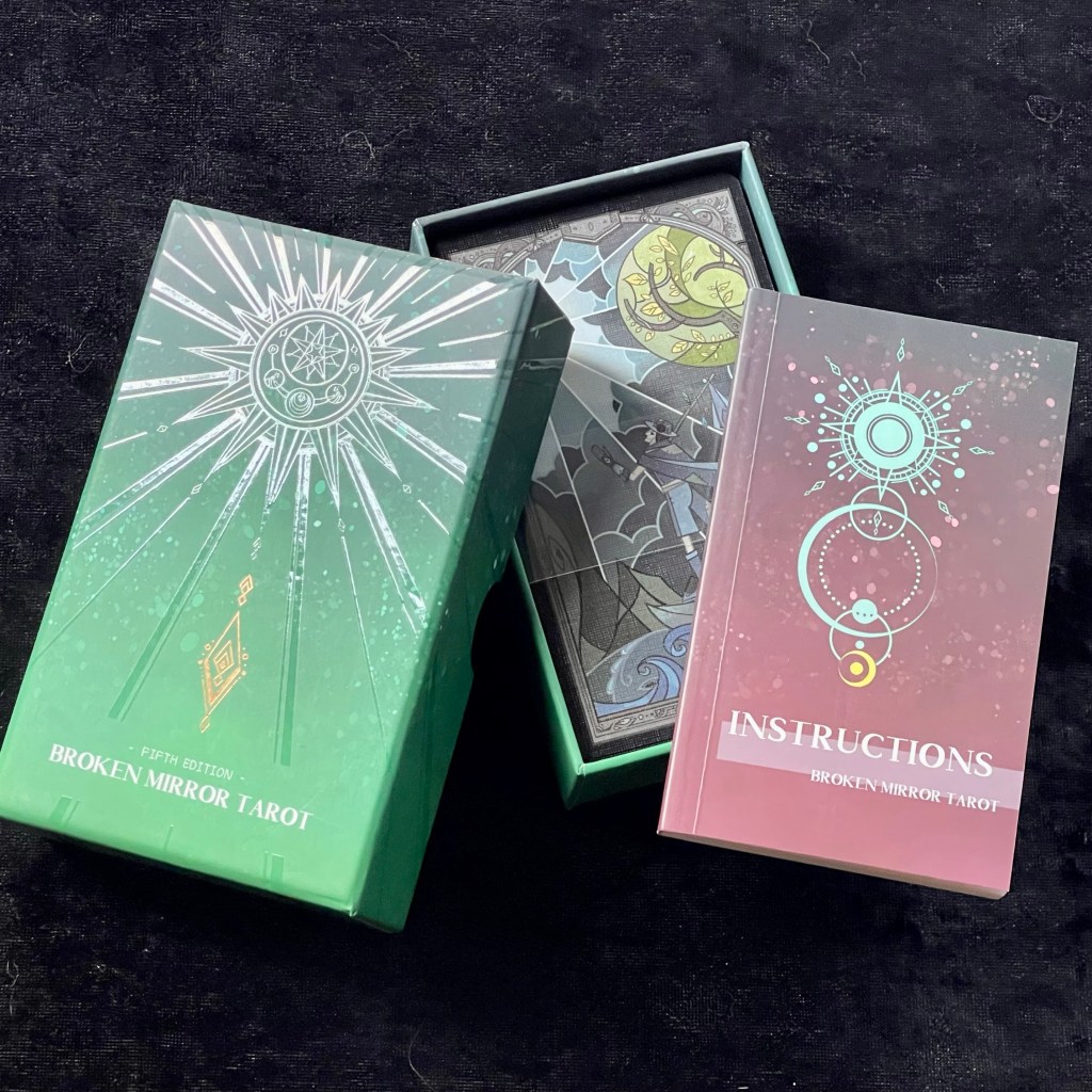 Broken Mirror Tarot 是以破碎鏡片的畫風設計出各款塔羅圖案而著名,牌邊為黑色窗框設計,似是教堂彩色玻璃窗畫一樣。Emerald 是新設計的版本,並非由第四版升級過來,不過構圖大致一樣,改動不大。