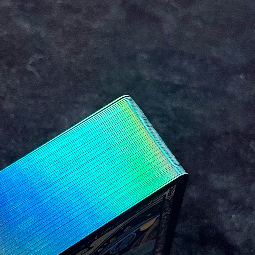 卡牌大小為傳統 12cm x 7cm,紙質很順滑,類似啤牌的網紋質地,斜一點也怕滑到地上。牌背設計以綠藍間條襯托中間的金黃太陽,比牌面更吸引。不過,最搶眼是燙綠牌邊,反射光極強,想不注意也難。