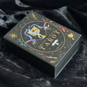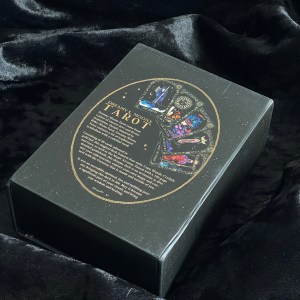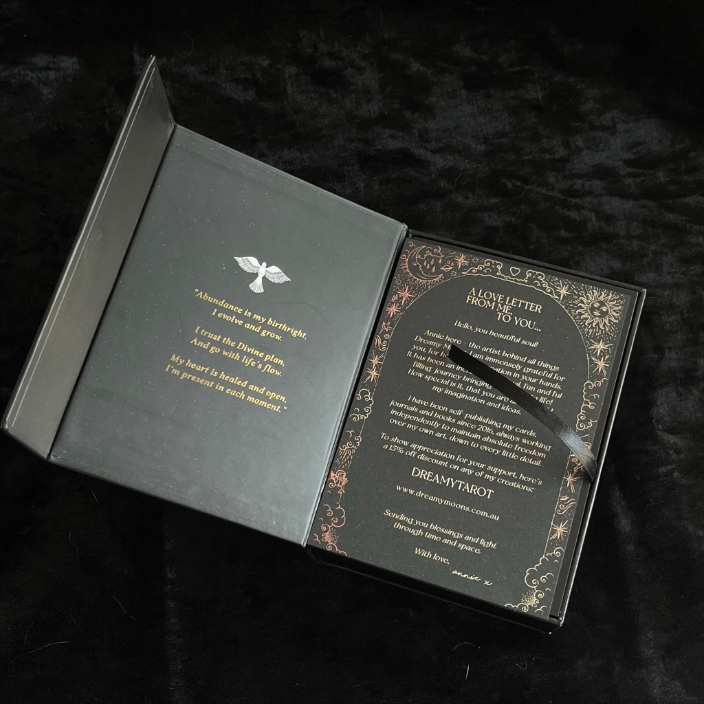 Dreamy Moons Tarot 有個黑色大型硬皮紙盒,磁石開口設計,裏裏外外的圖案和字體都是燙金,就算不是很閃,卻仍然相當高貴。