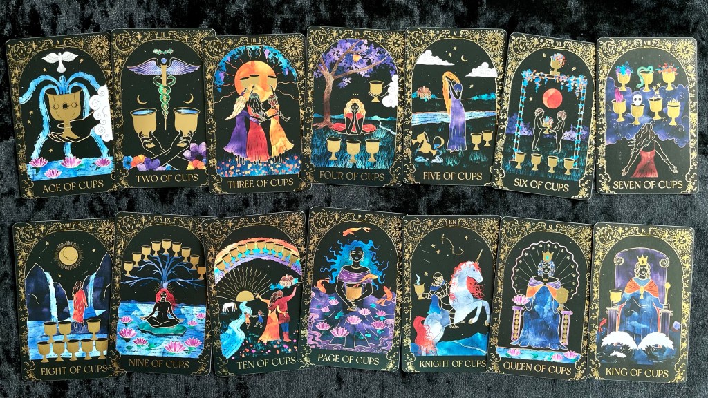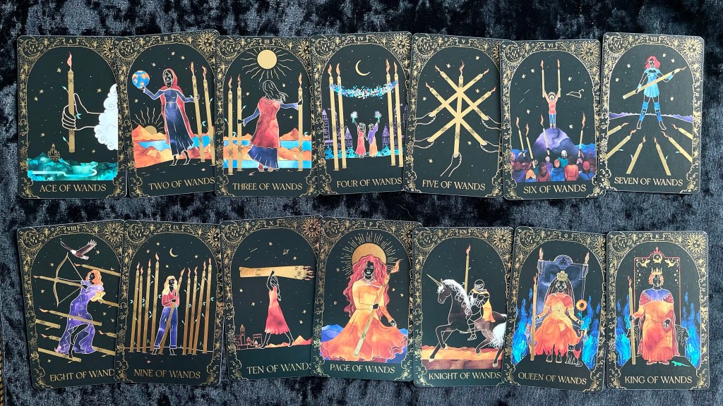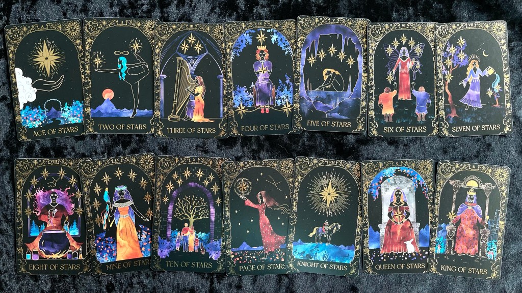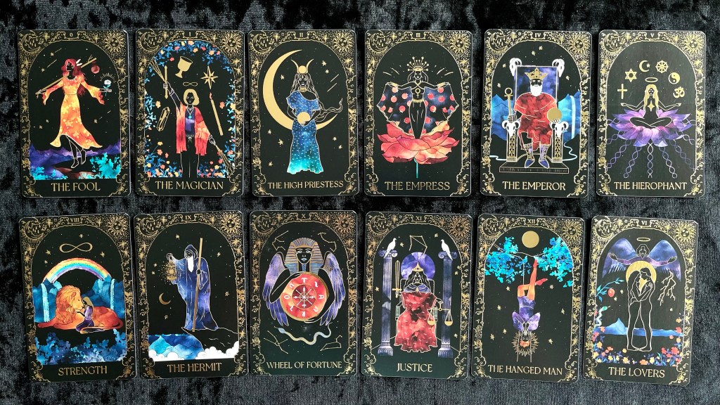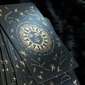 由於牌面以黑底為主,牌面又主要是燙金、橙色和藍色,顏色相比傳統偉特系統單調,所以建議新手解牌時不要看重顏色的意義。