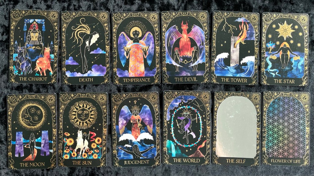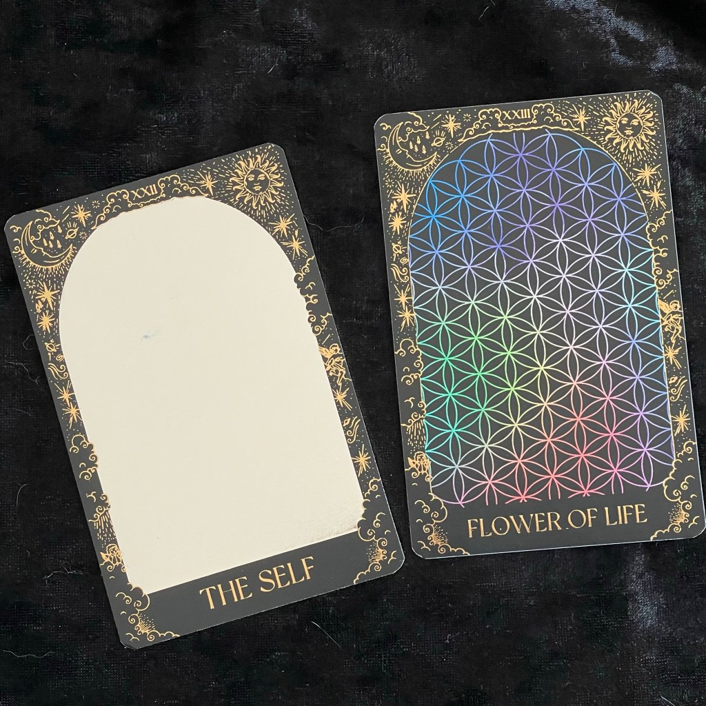前者 The Self 解作自己,牌面設計為一塊鏡子的反光塗層,象徵映照自己,要看清和接受自己的優點和缺點,不要欺騙自己。後者 Flower of Life 解作生命之花,牌面設計為滿滿的幻彩花紋,結構複雜,不過感覺很完滿。