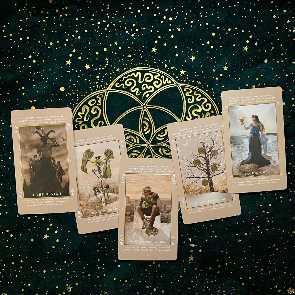 [5 of Pentacles] 錢幣5。睇牌面就知道唔係好對路,份工幾勞心勞力,錢唔易賺。